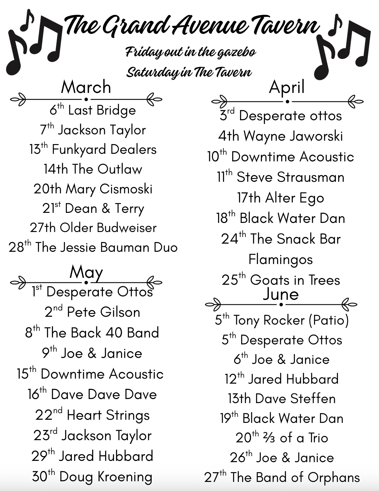 Join us for a delightful evening of live music at Tunes on the Terrence. With an inviting atmosphere and a lineup of talented artists, it's the perfect opportunity to unwind and soak in the melodies. Check out the dates below and be part of the fun!